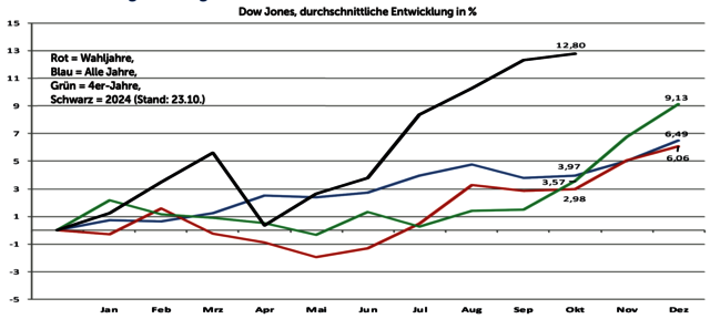 Die Einbeziehung von statistischen und saisonalen Gegebenheiten kann langfristig Vorteile für eine Investmentstrategie bringen – sowohl bei der Performance als auch bei der Volatilität der Anlage. In diesem Jahr sind allerdings einige dieser statistischen und saisonalen Wahrscheinlichkeiten nicht eingetreten. So laufen z.B. sowohl ein Wahljahr als auch ein auf eine 4 endendes Jahr beim Dow Jones bis in den Juli im Schnitt seitwärts (Daten seit 1900; siehe Chart oben). Dieses Mal ging es aufwärts. Die eher schwachen Monate August und September fielen aus – es ging z.B. beim DAX 4,41 % aufwärts. Und das eher maue Halbjahr Mai bis Oktober (DAX in den letzten 37 Jahren im Schnitt –0,1 %) gab es ebenfalls nicht – der DAX stieg um 4,47 % (Stand: 23.10.).