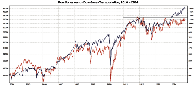 Anfang November beginnen nun die besseren 6 Monate des Börsenjahres – wenn die Statistik dann dieses Mal stimmt! Bemerkenswert bleibt weiterhin, dass in vielen wichtigen Indizes nur einige wenige Titel einen Großteil zum Gesamtergebnis beitragen. Ebenfalls bemerkenswert ist, dass der Dow Jones Transportation Anfang des Jahres den Dow Jones-Ausbruch auf neue Hochs nicht mitgegangen ist. Der Index notiert unter seinem Allzeithoch vom November 2021. Laut der Dow-Theorie müssen für einen eindeutigen Trend aber beide Indizes in dieselbe Richtung zeigen. Hier lohnt es sich also etwas genauer hinzusehen. Kommt der Dow Jones Transportation Index nach oder prallt er am Widerstand ab?