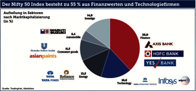 Es gibt aber auch zahlreiche indische Unternehmen, die für ausländische Anleger interessant sind. Die 50 nach Marktkapitalisierung größten Unternehmen Indiens werden im National NIFTY 50 zusammengefasst (s. Abb.). Allerdings ist ein direktes Investment an der Börse Mumbai schwierig, da hier hohe Auflagen bestehen. Über den Franklin FTSE India UCITS ETF können Anleger in Aktien mit hoher und mittlerer Marktkapitalisierung in Indien investieren. Der thesaurierende Fonds bildet den FTSE India 30/18 Capped Index nach und ist sogar sparplanfähig. Zu den größten Positionen gehören die auch in den USA notierten Infosys Technologies (ein auch in Deutschland tätiger IT-Serviceprovider) und Reliance Industries. Diese beiden Unternehmen wollen zusammen mit dem größten Bau- und Maschinenbauer des Landes, Larsen & Toubro (vgl. Tabelle), sowie einer Handvoll weiterer Unternehmen in den kommenden fünf bis acht Jahren zusammen mehr als 250 Mrd. US-Dollar in die eigene Wirtschaft investieren. Allein dies zeigt schon das riesige Potenzial, das hier schlummert.