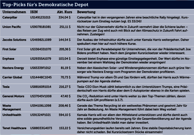 Das Programm läuft bis Ende 2026, und Kamala Harris dürfte es zumindest fortsetzen. Im Zuge dessen kündigte sie bereits an, neuen Wohnraum schaffen zu wollen. Auch hier stehen dann gerade Baukonzerne wie Caterpillar mit den notwendigen Baumaschinen oder auch Jacobs Solutions als Ingenieur- und Bauunternehmen in den Startlöchern. Das Unternehmen hat ebenfalls bereits von den Programmen der Demokraten profitiert und summierte das Kursplus seit Bidens Amtsantritt auf etwa 31 %.