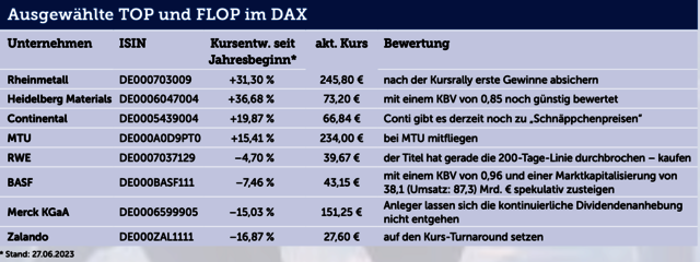 Hohe Energiepreise, Inflation, die Zinsstraffungen der Notenbanken und nun noch eine technische Rezession – die deutsche Wirtschaft hatte es in der 1. Jahreshälfte nicht einfach. Und doch gelang es dem DAX, neue Bestmarken aufzustellen. Neben einigen Gewinnern bergen aber gerade auch die vermeintlichen „Verlierer“ noch großes Aufholpotenzial und günstige Einstiegschancen. Der ES hat einige Top- und Flop-Picks genauer unter die Lupe genommen.